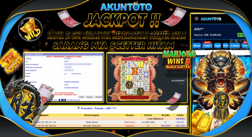 AKUNTOTO JACKPOT SLOT MAHJONG WINS 3 BLACK SCETTER Rp 15.900.000 RABU 01 OKTOBER 2025