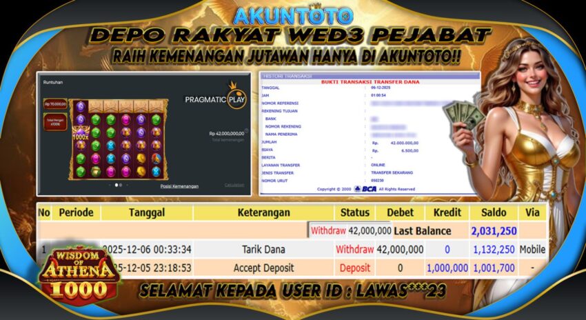 AKUNTOTO JACKPOT SLOT WISDOM OF ATHENA 1000 Rp42.000.000 SABTU 06 DESEMBER 2025
